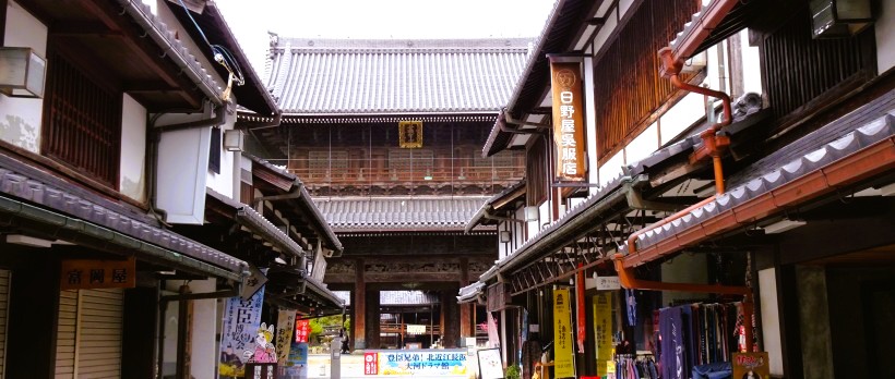 | ながはま御坊表参道は古くから「御坊さ ん」と呼ばれる大通寺に至る参道です。道路は石畳化され歴史的な景観を作り出していて、まっすぐ進めば大通寺の山門にたどり着きます。石畳の両側には、今も、寺に関するものの店があり、趣深い店もあります。 |