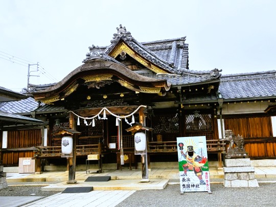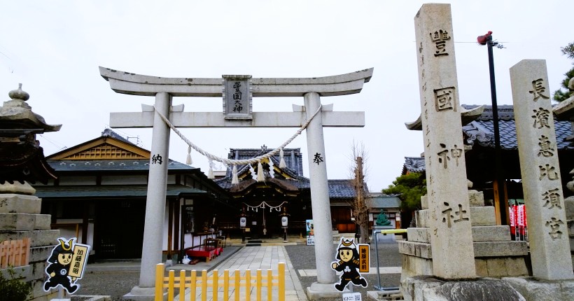 | 長浜豊国神社は安土桃山時代秀吉の没後に長浜の町民がその遺徳を偲んで建立しましたが、大坂夏の陣で豊臣家が滅びると、徳川幕府は神社を取り壊すよう命じました。町民は、一時、祭神を町年寄の家へ移し、八幡宮の古堂を移築して、商売の神様である恵比須神を前立に、奥殿に秀吉像をひそかに祀り、長い江戸時代を過ごしました。そして、明治31年(1898)の秀吉300回忌に社殿を造営して現在の社容を整えました。 多くの豊国分社が廃絶したなかで、長浜の豊国神社が四百年間、連綿と守り伝えられてきたのは、町衆の秀吉に寄せる想いの発露です |
