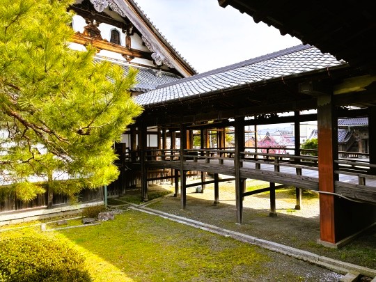 | 本堂や大広間は、伏見城の遺構と伝わる重要文化財で、絢爛豪華な桃山文化を随所に垣間見られます。本堂は、もとは伏見城の殿舎です。かつては秀吉が朝鮮侵略に先立って軍議をしたところですが、大通寺に移され本堂となり、現在は国の重要文化財に指定されています。 |