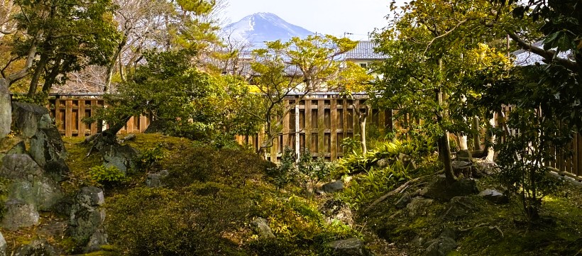 | 含山軒庭園は、伊吹山を借景として鑑賞式枯山水です。含山の名はこれに由来しています。前方に盛砂を敷き、中ほどに亀島を配して、伊吹山から枯滝に水が注いで見えるよう設計されています。 |