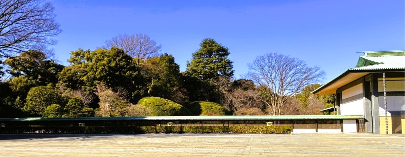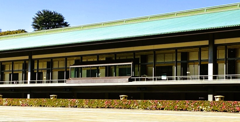 | 宮殿は、皇居の中でも、最も格式ある建物として知られていて、天皇皇后両陛下の住まいではなく国賓を迎えたり、公式行事や国の儀式が行われる公の場として使われています。手前側に見える長い棟は長和殿で、全長は約160mあります。宮殿自体はこの奥にもあり、中庭を挟むようにカタカナの「ロ」の字に造られ、長和殿から一番奥にある表御座所までは、約150mあります。 |