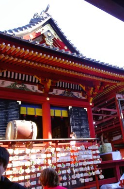 | 本宮は大石段の上にある上宮と、大石段向かって右手にある若宮(下宮)の上下両宮という形で1191年に整えられました。現在の本宮は1828年に江戸幕府11代将軍徳川家斉の命により再建されたもので、屋根に曲線を与えた流造と、本殿と拝殿を一体化した権現造、その両方の特徴を兼ね備えた、流権現造の代表的な江戸建築です。 |