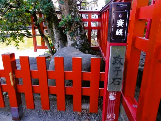 | 弁財天社の裏手にある政子石は、源頼朝が妻の政子の安産を祈願したとされる石です。夫婦円満の祈願石で姫石とも呼ばれ、子宝や安産のご利益もあるとされています。 |