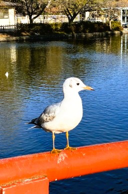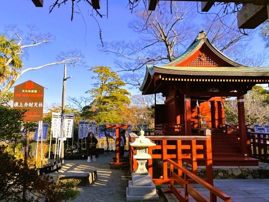 | 旗上弁財天は源氏池の中の島に鎮座しています。頼朝の旗上げにちなみ、源氏の二引きの旗に願をかける人もいます。 |