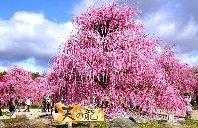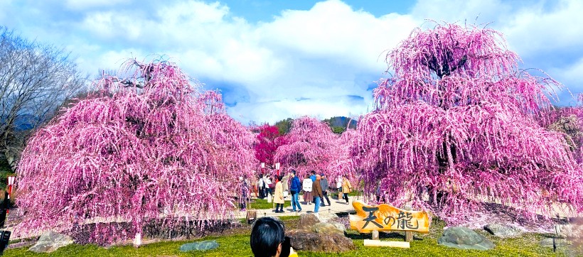 | 入口から入場すると 「天の龍」「地の龍」と名付けられた日本最古と思われる2本のしだれ梅の古木が迎えてくれ、その迫力に圧倒されます。 |