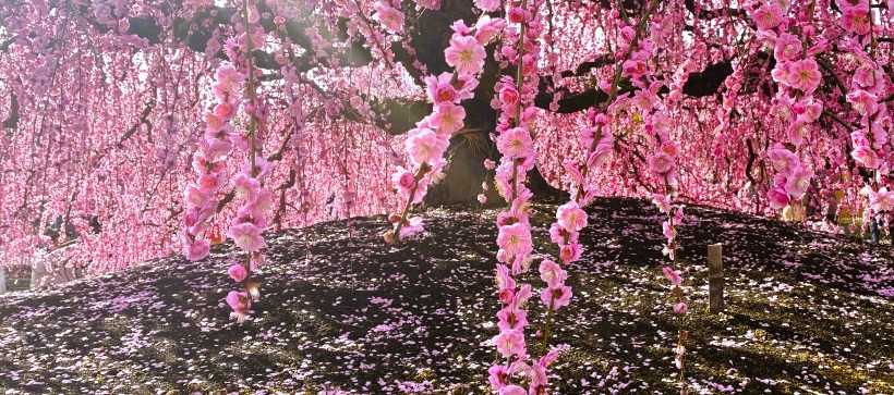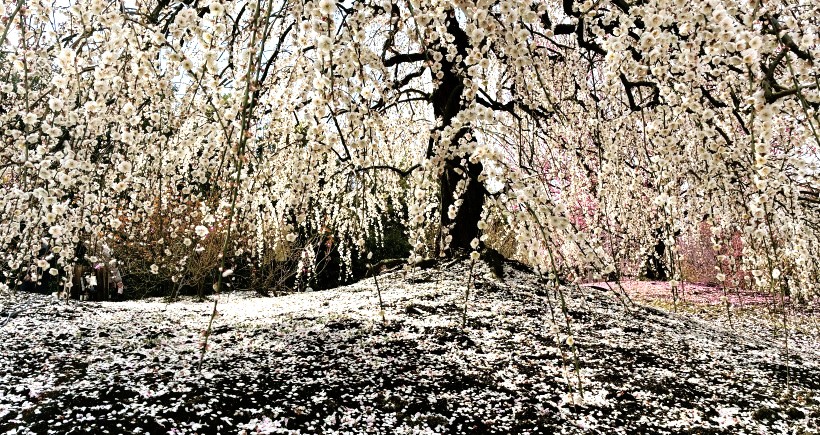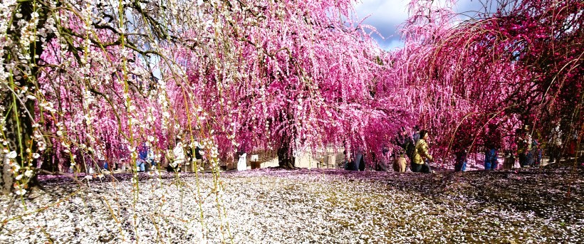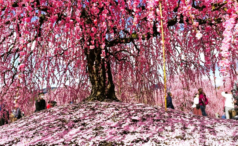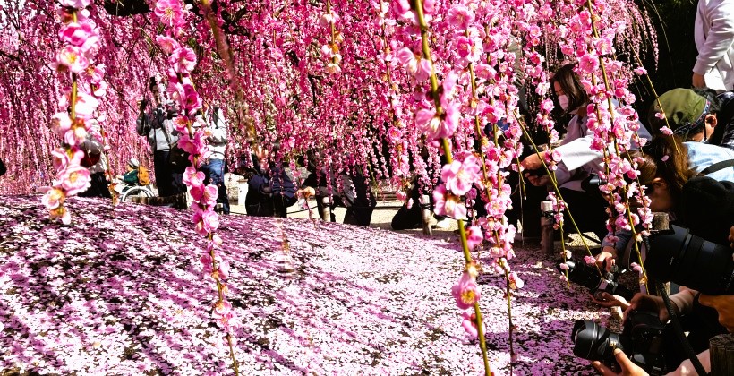 | しだれ梅の下には散った梅の花が桃色の絨毯となり、その美しさに感動し多くの人がカメラを向けます。 |