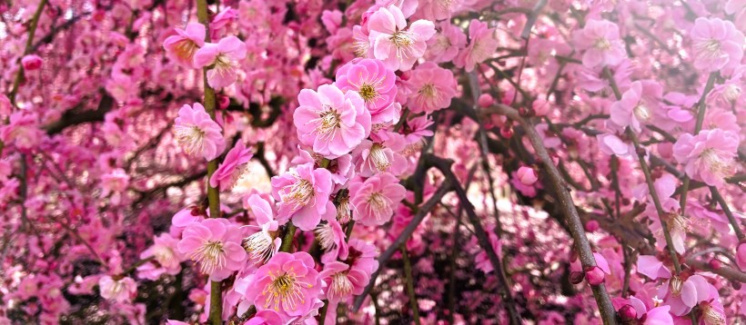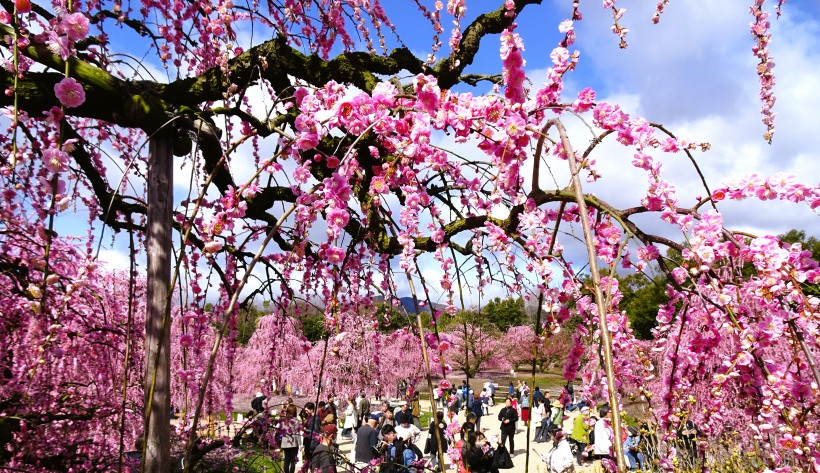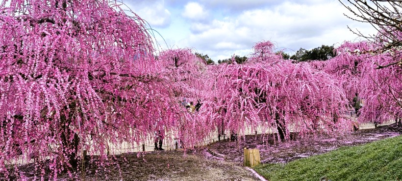 | 園内にはしだれ梅の代表品種である「呉服(くれは)しだれ」を中心に、「白滝しだれ」「難波しだれ」「鹿児島紅」「白加賀」など、手入れの行き届いた約200本の梅の名木が植栽されています。 |