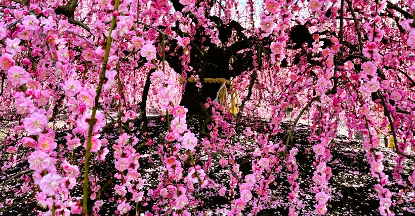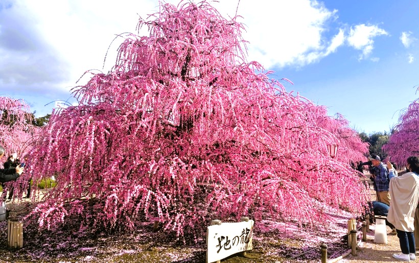 | 力強く広がる枝ぶりと、滝のように垂れ下がる花姿は、長い年月を重ねてきた梅の生命力を感じさせ、多くの来園者を魅了します。 |