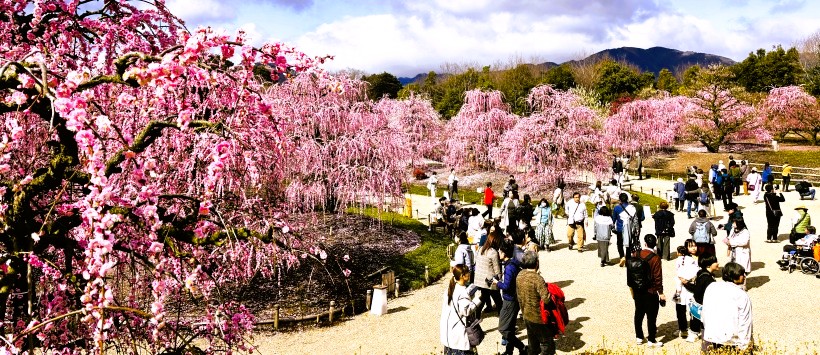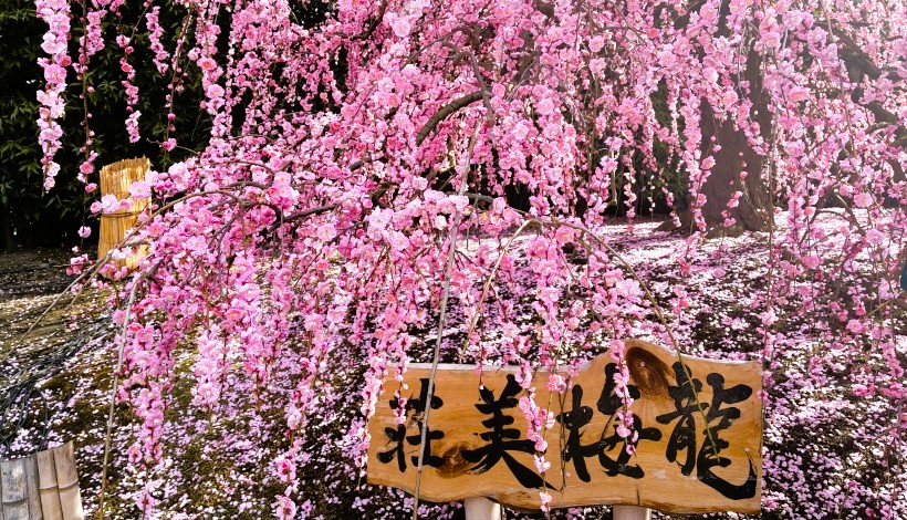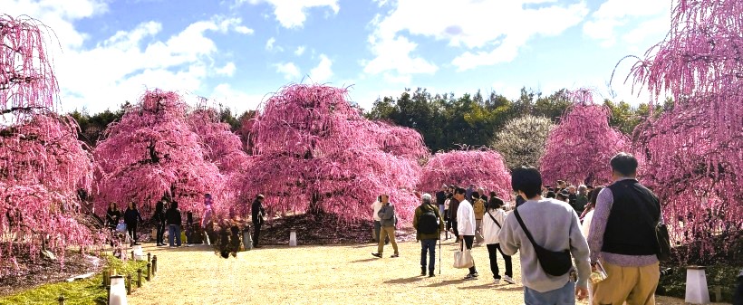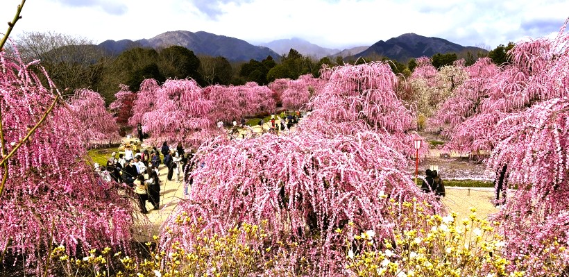 | 鈴鹿山脈を借景に、匠の技で仕立てられた「しだれ梅」の名木古木を鑑賞できる研究栽培農園である鈴鹿の森庭園は期間限定で一般公開されています。2026年は梅の開花が早く、訪れた2月28日はまさに見頃でした。 |