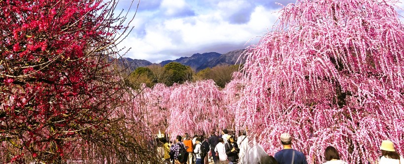 | 約200本の梅の名木が鈴鹿山脈を背景に咲き誇ります |