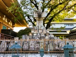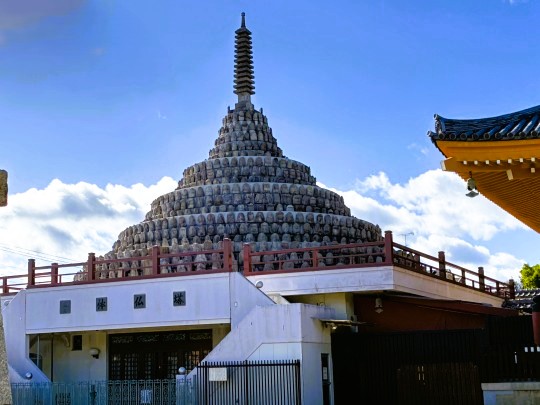| 千体仏塔は1989年に建立された塔で、京都市内の地下鉄工事の際に出土した1,000体の石仏を安置しています。室町時代からの阿弥陀如来像や地蔵菩薩像など1,000体が、ミャンマーのパゴダに似て円錐形に安置されています。 |