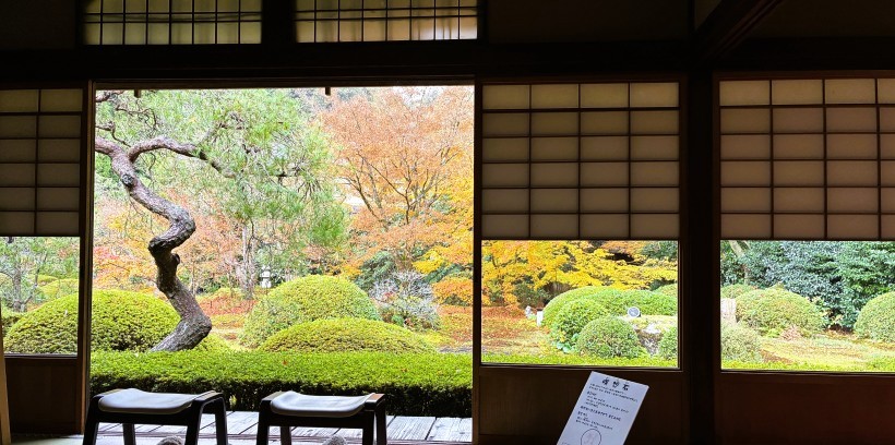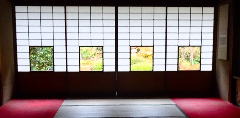 | 蓮華の間の障子窓をのぞくと、それぞれ4つのちがった景色を見ることができます。左の窓から順に、椿、灯籠、紅葉、松が見え、情緒を感じることができます。 |