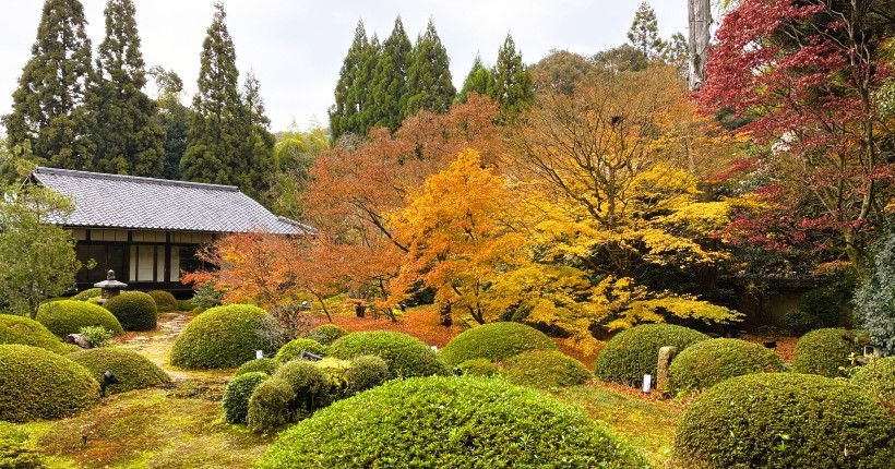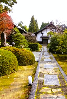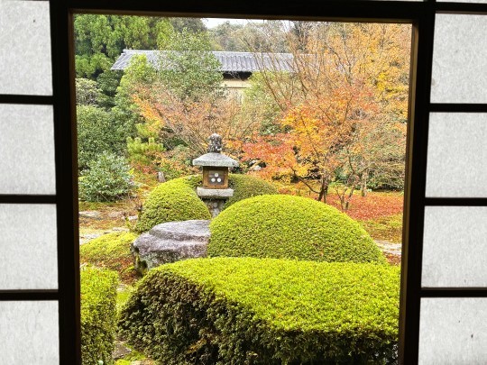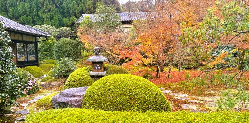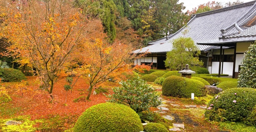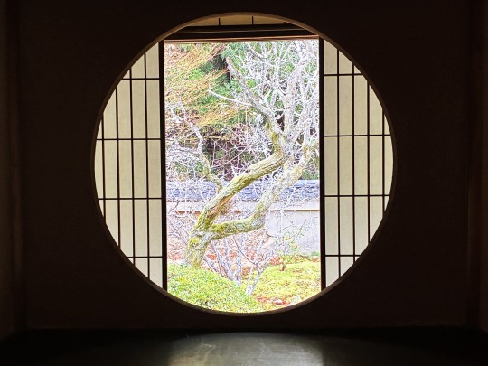 | 正確な真円を描いてる「悟りの窓」は禅における悟りの境地を表していて、春には紅梅やハナカイドウを望むことができます。四角い窓は「迷いの窓」で人生における苦しみを象徴し「生老病死四苦八苦」を表しているといわれています。 |