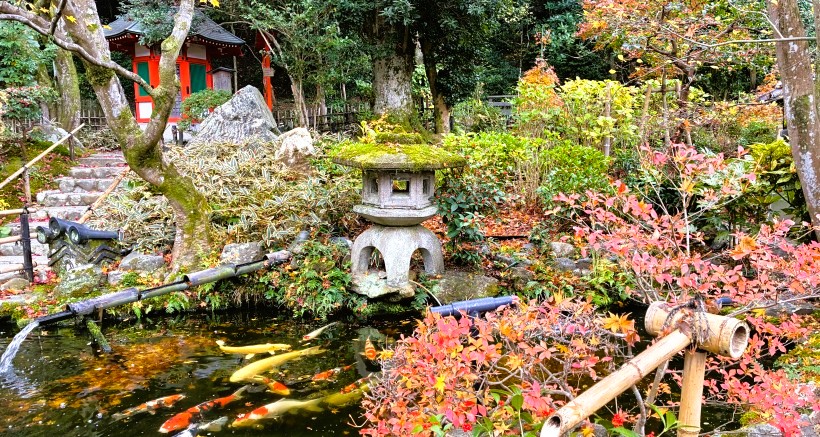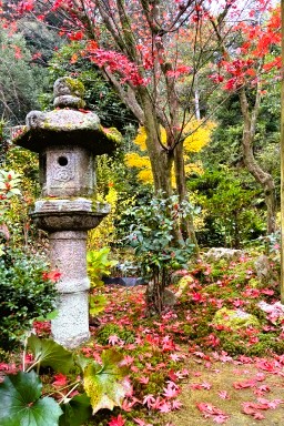 | 春の枝垂れ桜、秋の紅葉が魅了する庭園には、大日如来の変化身である愛染明王を祀る橙色の小さな八角堂の愛染堂があります。愛染明王は、泉山七福神巡り番外札所です。 |