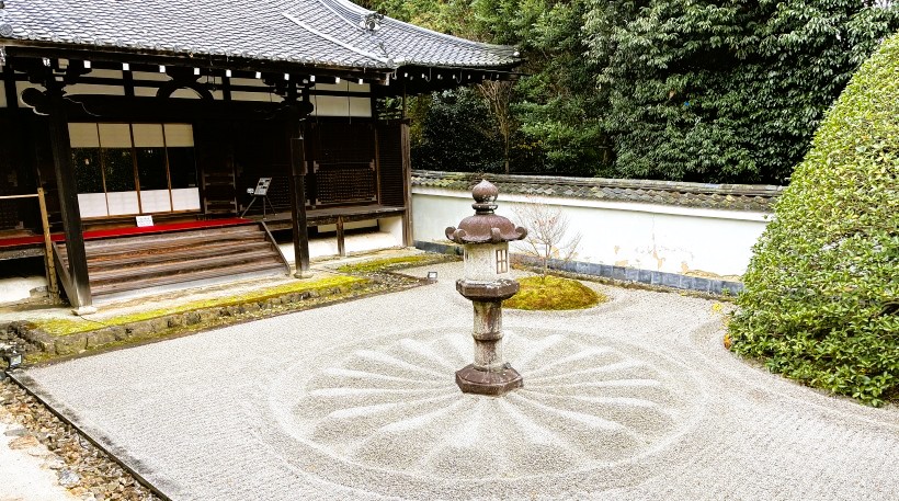| 霊明殿には後水尾天皇から孝明天皇までの歴代天皇、東福門院・普明照院といった江戸時代の皇子・皇女の御尊牌が祀られています。石庭の砂の盛り方がとても立体的です。皇室ゆかりの寺ということで、菊の御紋を表した砂紋になっています。中央に立つ石灯籠は、江戸幕府15代将軍、徳川慶喜から寄進されたものです。 |