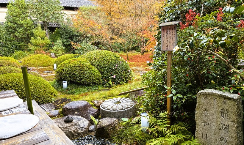 | 大倫の間は四季折々の美しい庭園を眺めることができる広間です。大倫とは、人として行なうべき大切な道理です。大倫の間では、瞑想用の椅子や石が並べられています。京都の奥座敷にふさわしく、外の喧騒から一切離れた時間を過ごすことができます。 |