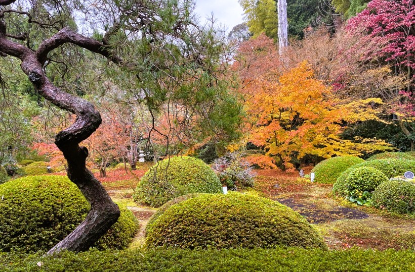 | 庭園の紅葉がとてもきれいです。奥に一本の杉の木があります。この杉の木は、かなり昔に落雷にあったそうで、現在は杉の木のてっぺんに避雷針が取り付けられているとのことです。 |