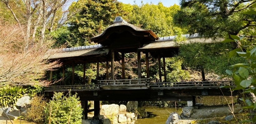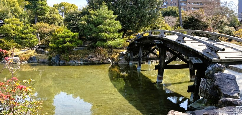 | 侵雪橋印月池の西北岸から縮遠亭のある島へ渡る木造の反橋です。 |