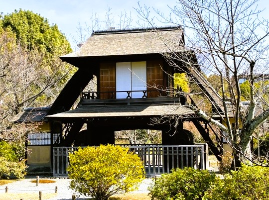 | 傍花閣は園林堂(持仏堂)の東方、山門にあたる位置に建てられています。庭園内には珍しい楼門作りで、左右側面に山廊と呼ばれる階段の入口があり、階上には四畳半の部屋を設けています。奔放で軽快な構成と穏やかな数奇屋造の手法を兼ね備えた、園内でも特に個性的な建築です。 |