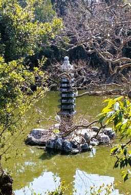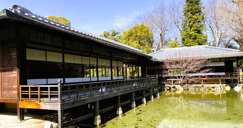 | 漱枕居は印月池の西南に位置し、水上にのりだすように建てられています。「漱枕居」の名は、旅路にあることを意味する漱流枕石の語からとられています。 |