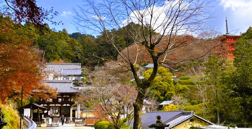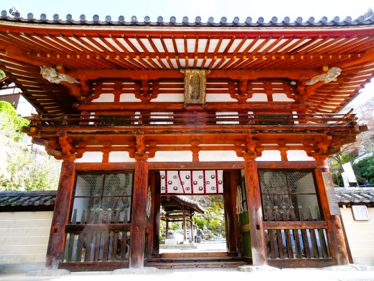 | 岡寺は飛鳥の東、山の中腹にあり、坂を上ると重要文化財に指定されている鮮やかな朱色をした仁王門があらわれます。本堂などはその奥、石垣の上に建ちならびます。 |