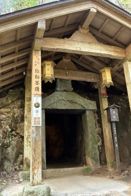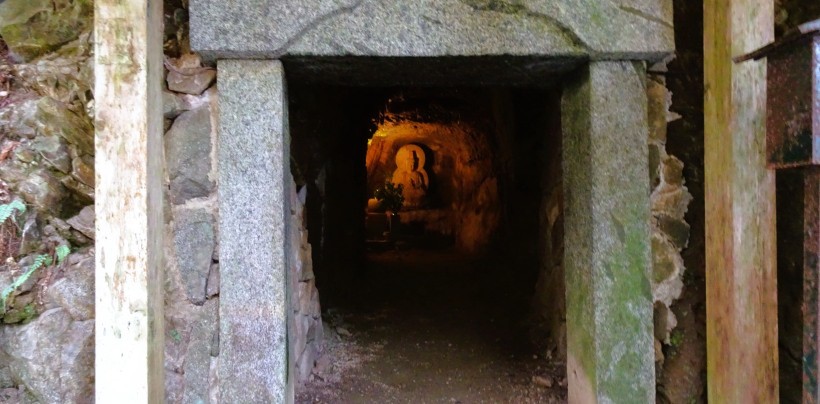 | 奥之院石窟は稲荷社のすぐ隣に石の洞窟で、奥に弥勒菩薩像が祀られています。「弥勒の窟」とも呼ばれています。入口がかなり低いので頭上に注意です。 |