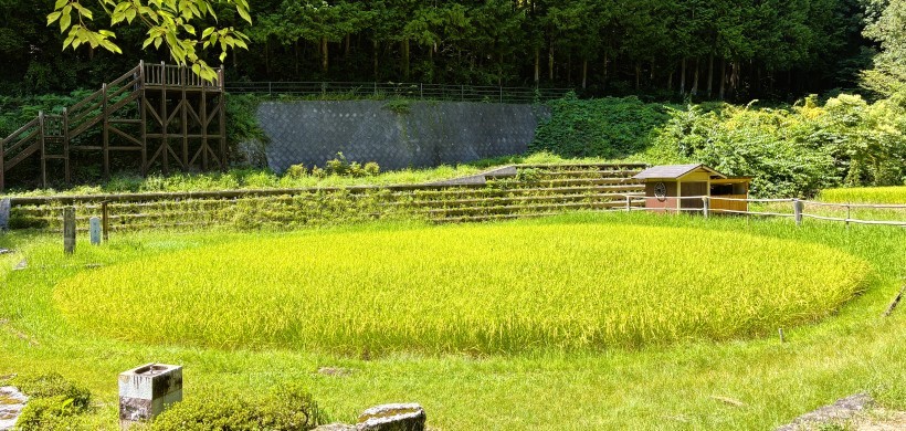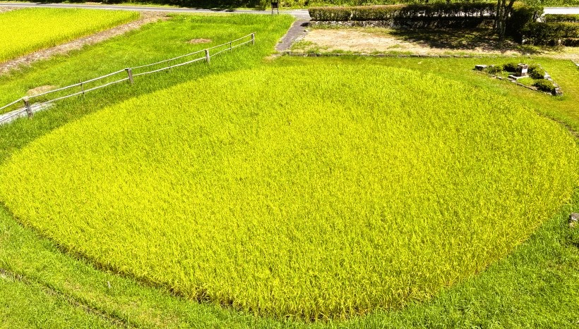 展望台から見ると円形であることがよくわかります。丸く円形に植えるのは、円は太陽の恵み、豊作の神が降りてくる目印です。中心から植えることで神さま仏さまに奉納する米をまたがないなどの意味があります。 |