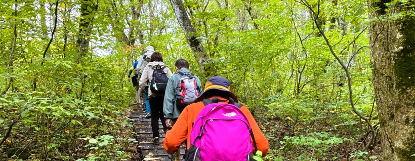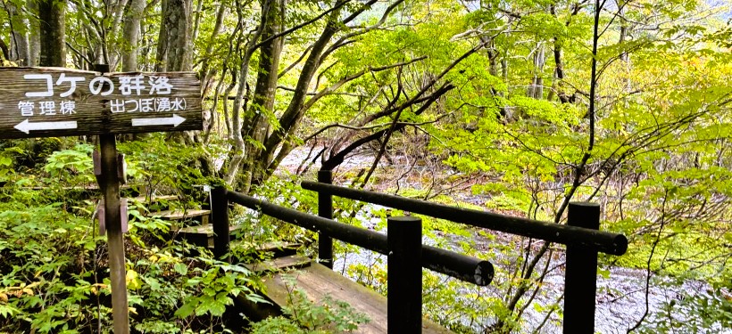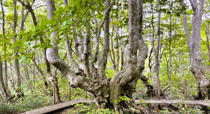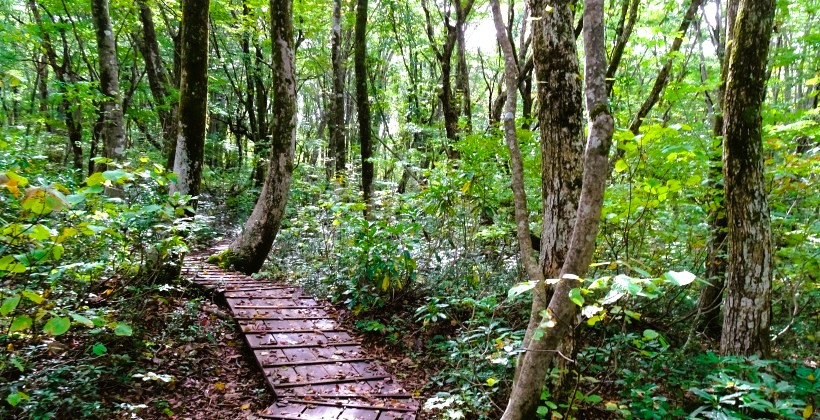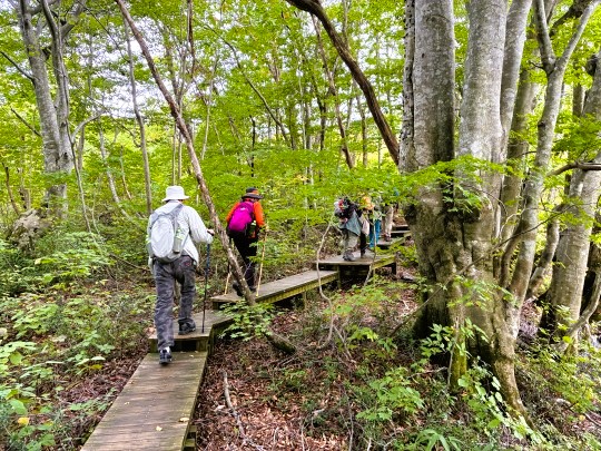 ブナ林の中を木道がすり抜けるように設置されています。木道を歩いて「あがりこ大王」や鳥海マリモを見てまわるコースが設定されていて、約5kmの道のりです。 |