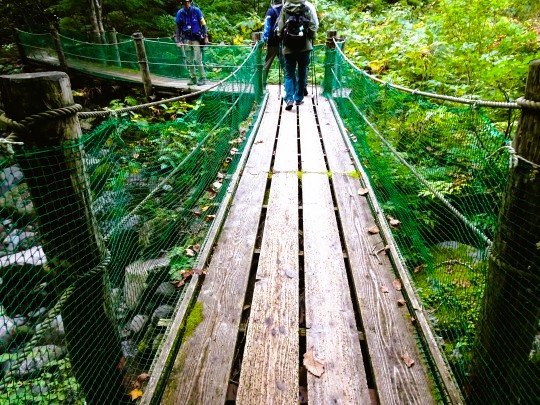 赤川にかかった吊橋を渡ります。 |