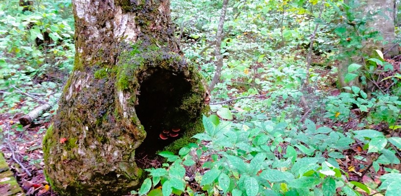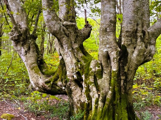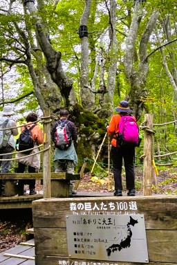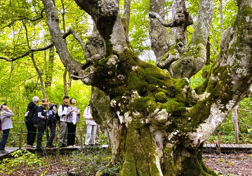ブナの巨木である「あがりこ大王」は、推定樹齢300年以上といわれており、森の神が宿っているかのような神秘的な威容です。幹回りが7.62mあり、樹高は25mと奇形ブナとしては日本一の大木です。幹が途中から5本程度枝分かれしているのが特徴で、ブナの切り口がコブ状にもりあがっています。江戸時代末期から昭和の時代まで続いていた炭焼きのために伐採した枝が、芽を出し成長を続けたことが、この独特な樹形の理由だと言われています。 |