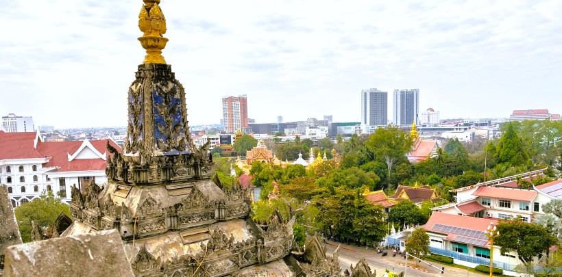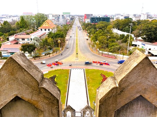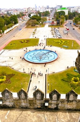 | 周りに高い建物もなく、開けているので360度 ビエンチャンの街並みを眺めることができます。南側はラーンサーン通りです。この通りがシャンゼリゼを意識して作られているのです。この更に先にメコン川が流れています。 |