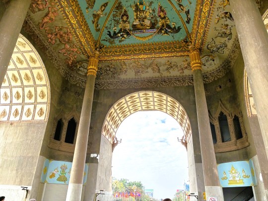 | 注目すべきは門の下に施された豪華絢爛なレリーフの数々です。下から見上げると、シンプルな外観とは打って変わって派手な装飾が目に入ります。ラオスでよく使われる神々のレリーフがあります。太い四本の柱で支えられ、そのうちの二か所が空洞となっていて、らせん状の階段が設けられています。 |