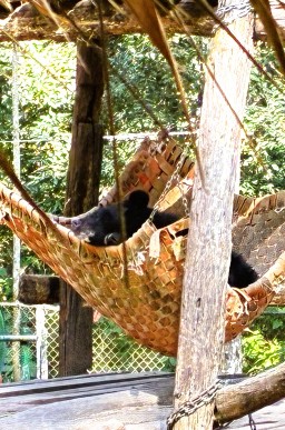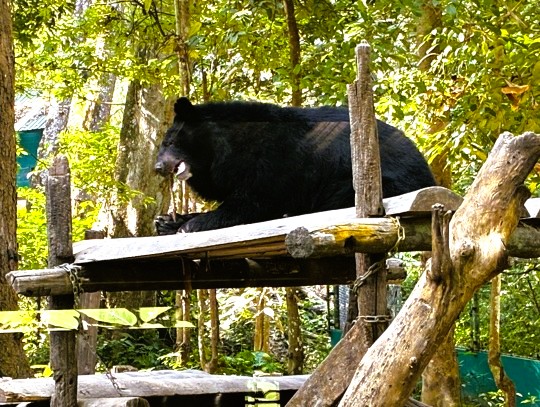 | クアンシーの滝の園内には、NGOが運営するクマの保護センターが併設されています。密猟や違法取引から救出されたクマたちが、ここで保護されています。 滝へ向かう道中ではラオスで生まれたツキノワグマの生態を観察することができます。 |