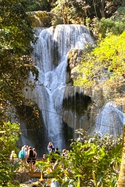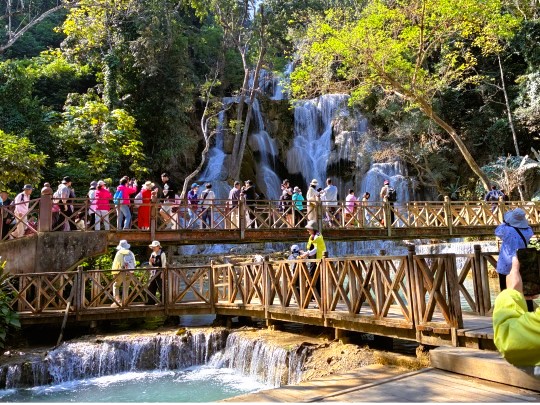 | クアンシーの滝の最上部です。滝の前の橋の上では常に多くの人が滝を眺めたり、写真を撮ったりしています。遊歩道が設置されていて、滝壺の上を歩いたり、迫力満点のクアンシーの滝を正面から眺めることができます。 |