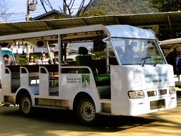 | 入場後は、クアンシーの滝の入口まで行く電動カートに乗り込みます。電動カートで数分山道を上って行くと、土産物屋や食堂が両脇に軒を連ねた通りの手前の駐車場に到着します。 |