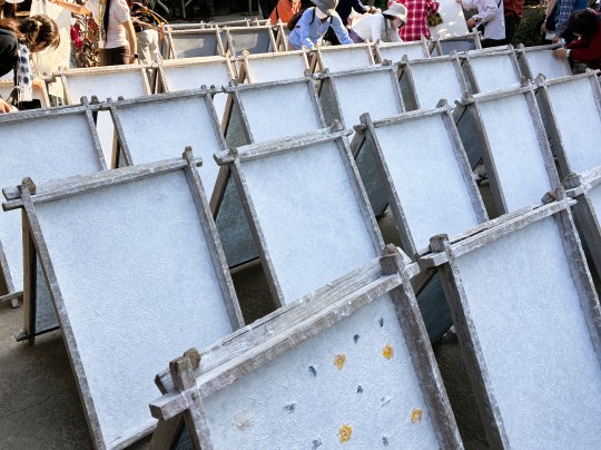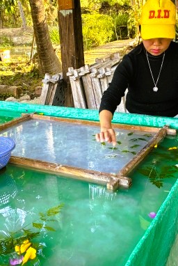 | 織物の村には紙漉きの伝統もあります。花びらを散りばめた手漉きの紙を天日で乾かしています。 |