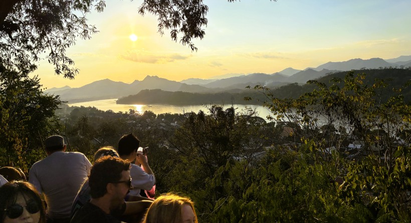 | プーシーの丘の最大の見どころは、何と言っても山頂からの絶景です。山頂からは、町並み・メコン川・ナムカーン川の合流が一望できます。夕暮れ時は特に人気で、黄金色に染まる街と川の景色は必見です。多くの人が夕陽を見ようと訪れ、山頂はごった返していました。 |