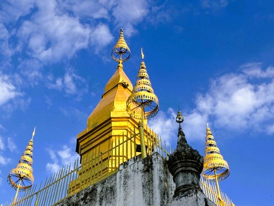 | 山頂には1804年に建立された黄金の仏塔タート・チョムシーがあります。高さ約24メートルのこの仏塔は、ルアンパバーンの街のどこからでも見ることができ、街のランドマークとなっています。仏塔の中には黄金の仏像が祀られています。仏塔の周りにも小さな祠や仏像が点在し、地元の人々の信仰の場となっています。 |