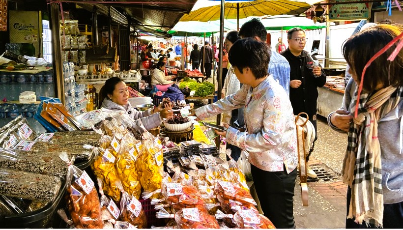 | 毎日午前5時から市場は徐々に活気づき、通りや路地には屋台が並び、地元の人と観光客が大勢詰めかけて賑わっています。ルアンパバーンの一日は、この「托鉢」から「朝市」へと続く流れがとても自然のように感じました。 |