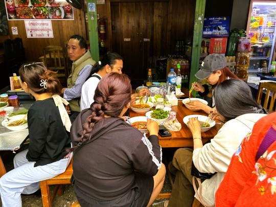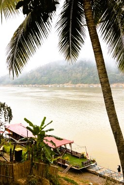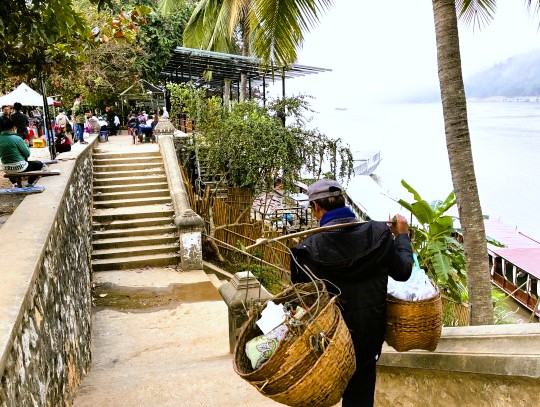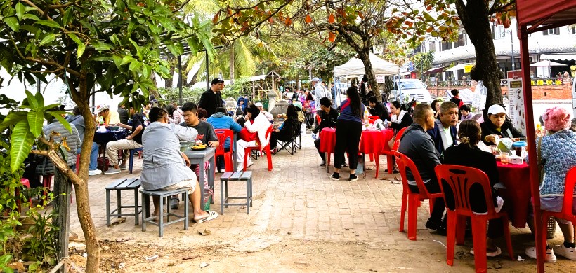 | メコン川の河岸には外で朝食を楽しむ人が数多くいました。 |