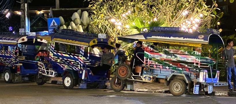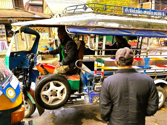 | 流しのタクシーがいないラオスで、市内観光の強い味方となるのがトゥクトゥクです。トゥクトゥクとはオート3輪車の事で、ラオスだけでなくタイやインドでも同じような乗り物を目にすることができます。 |