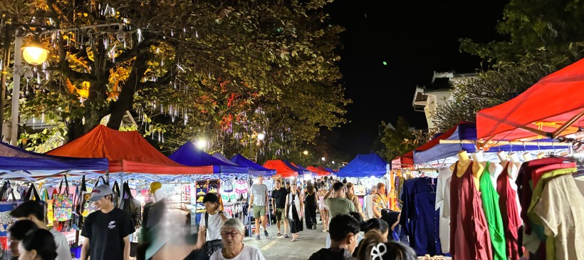 | 毎晩メインストリートで開催されているナイトマーケットは大勢の観光客で賑わっています。約250の店舗には、ラオスの伝統工芸品やルアンパバーン近郊に暮らすモン族が作った布製品を中心に、たくさんの雑貨が販売されています。 |
