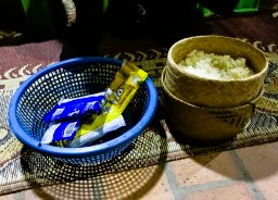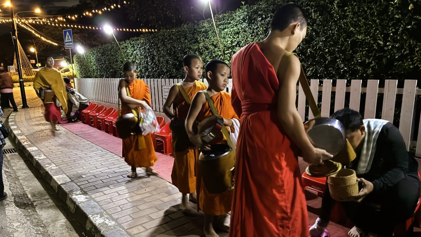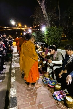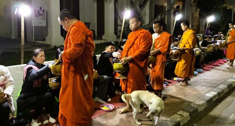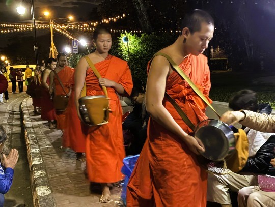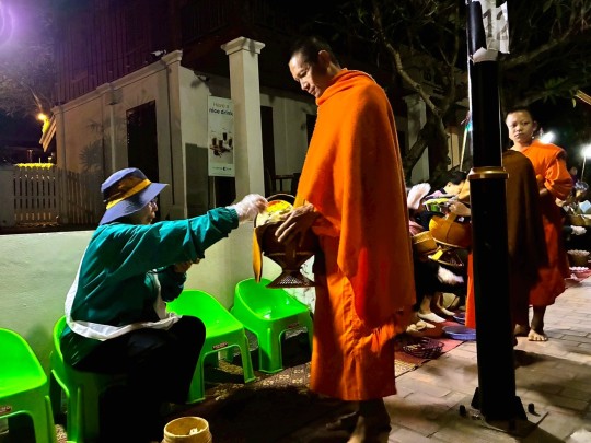 | 日の出前に喜捨用のもち米やお菓子を購入してストリートに並んでいる椅子に座って僧侶が来るのを待ちます。日の出前の暗い中、寺院からオレンジ色の袈裟を着た僧侶たちが大量に出てきます。僧侶たちがもっている袋に、お供え物を入れます。餅米は手で摘まんで入れます。観光客は使い捨て手袋をしていますが、地元の人は素手のようです。次々と僧侶が来るので結構忙しいです。 |