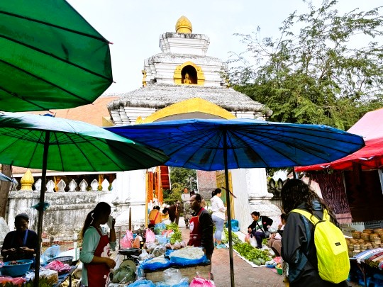 | 店と言っても,地面に並べて売るというスタイルです。寺院の前もおかまいなしに店が並んでいました。 |