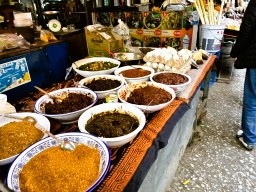 | 紫芋やタマリンド、干し豚肉、麺類、さまざまな昆虫スナックなど、多種多様な特産品が独特の食文化を披露します。 生魚や生肉のコーナーもあり、その場で肉をさばいています。 |